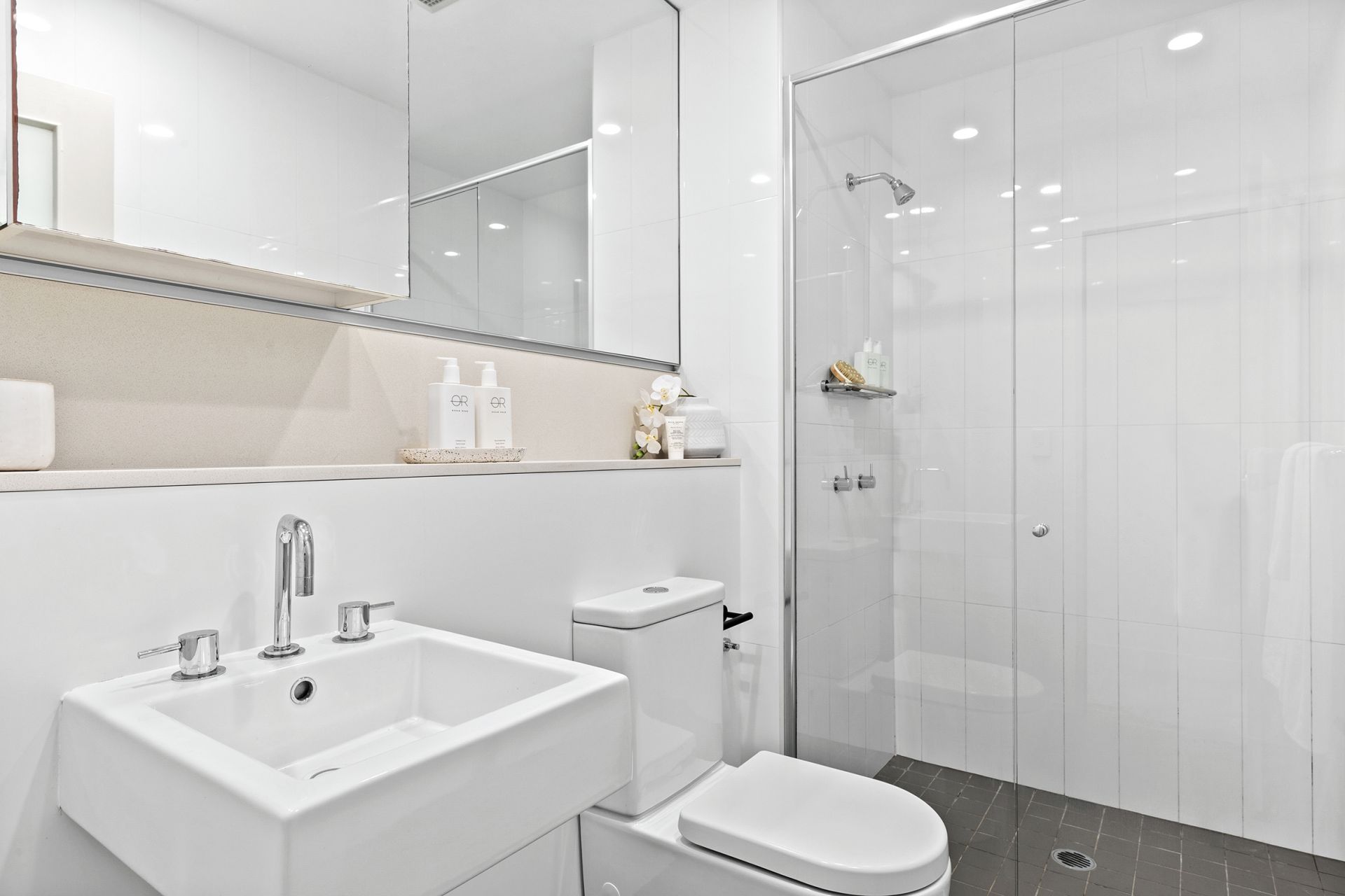 Contemporary bathroom w/ modern finishes & excellent storage