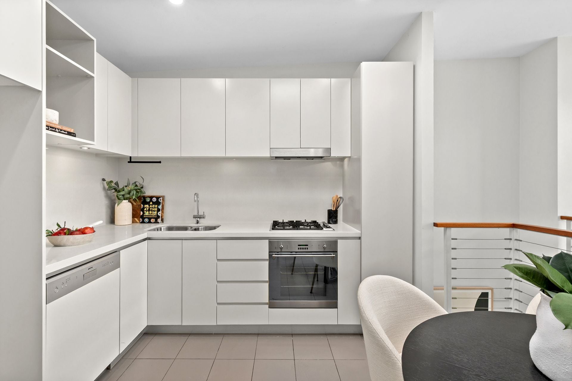 Sleek gas-appointed kitchen w/ skylit dining, stone benchtops, S/S appliances & ample storage