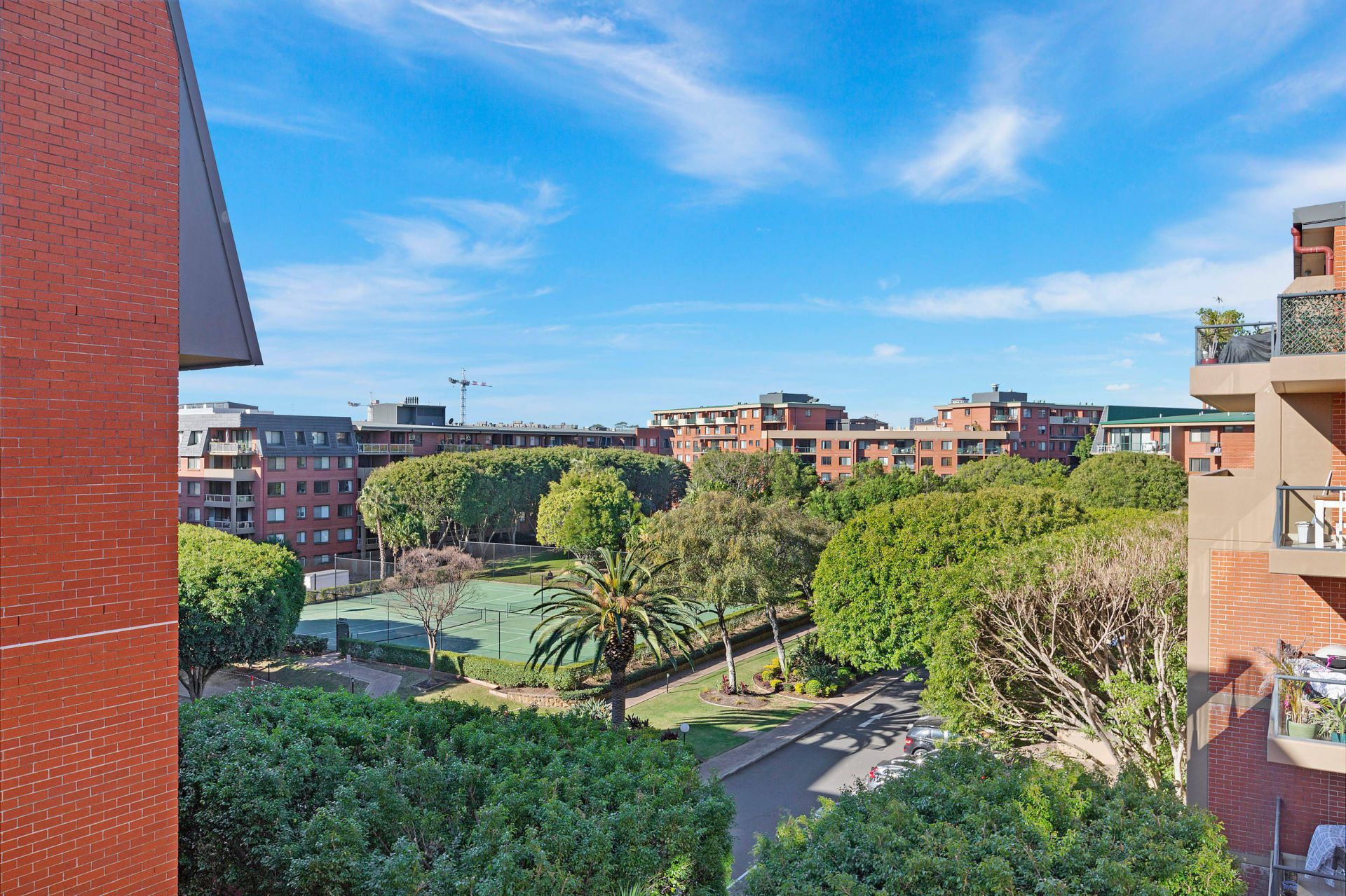 North facing full width balcony w/ leafy complex views