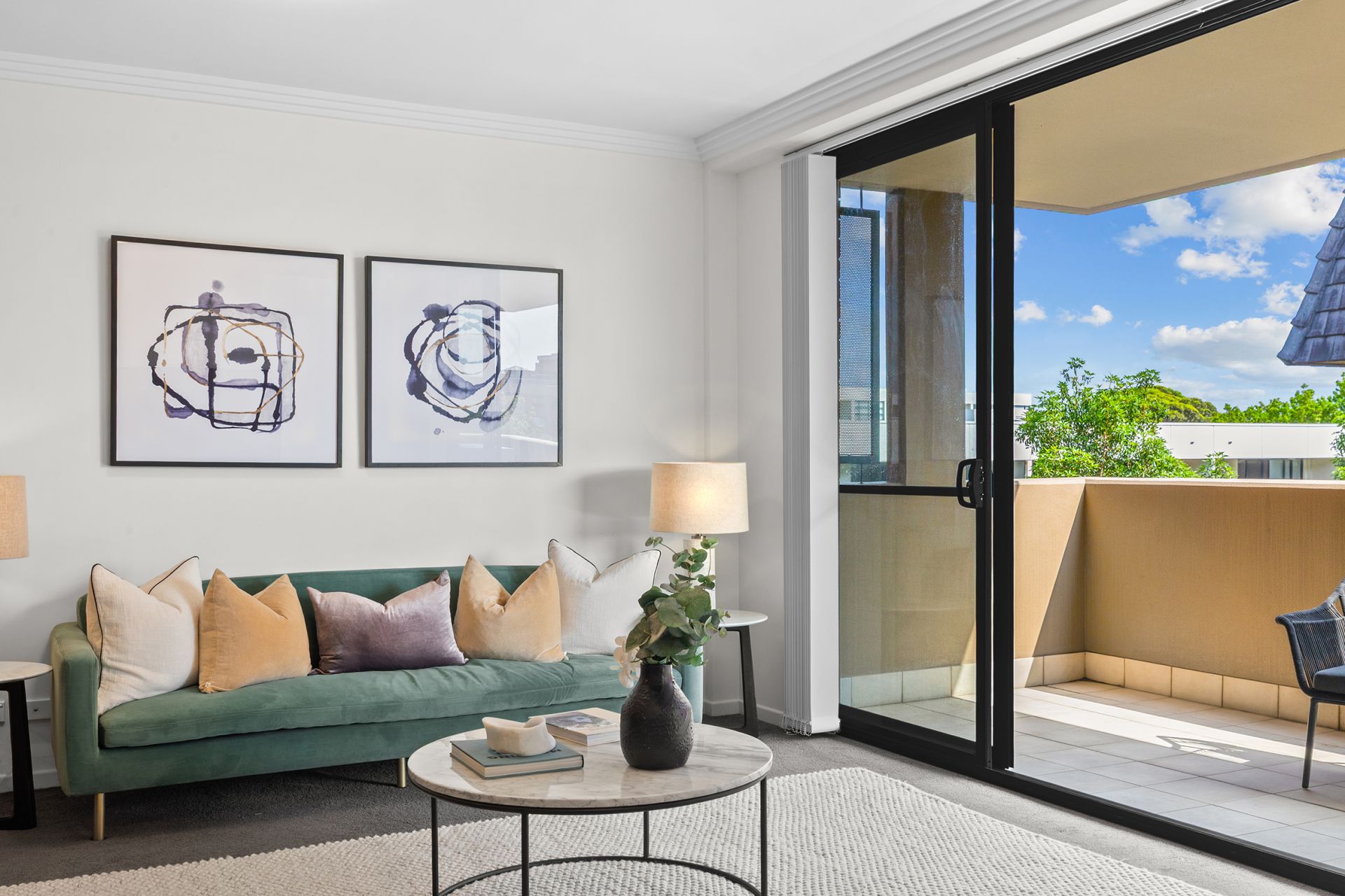 North facing full width balcony w/ leafy complex views